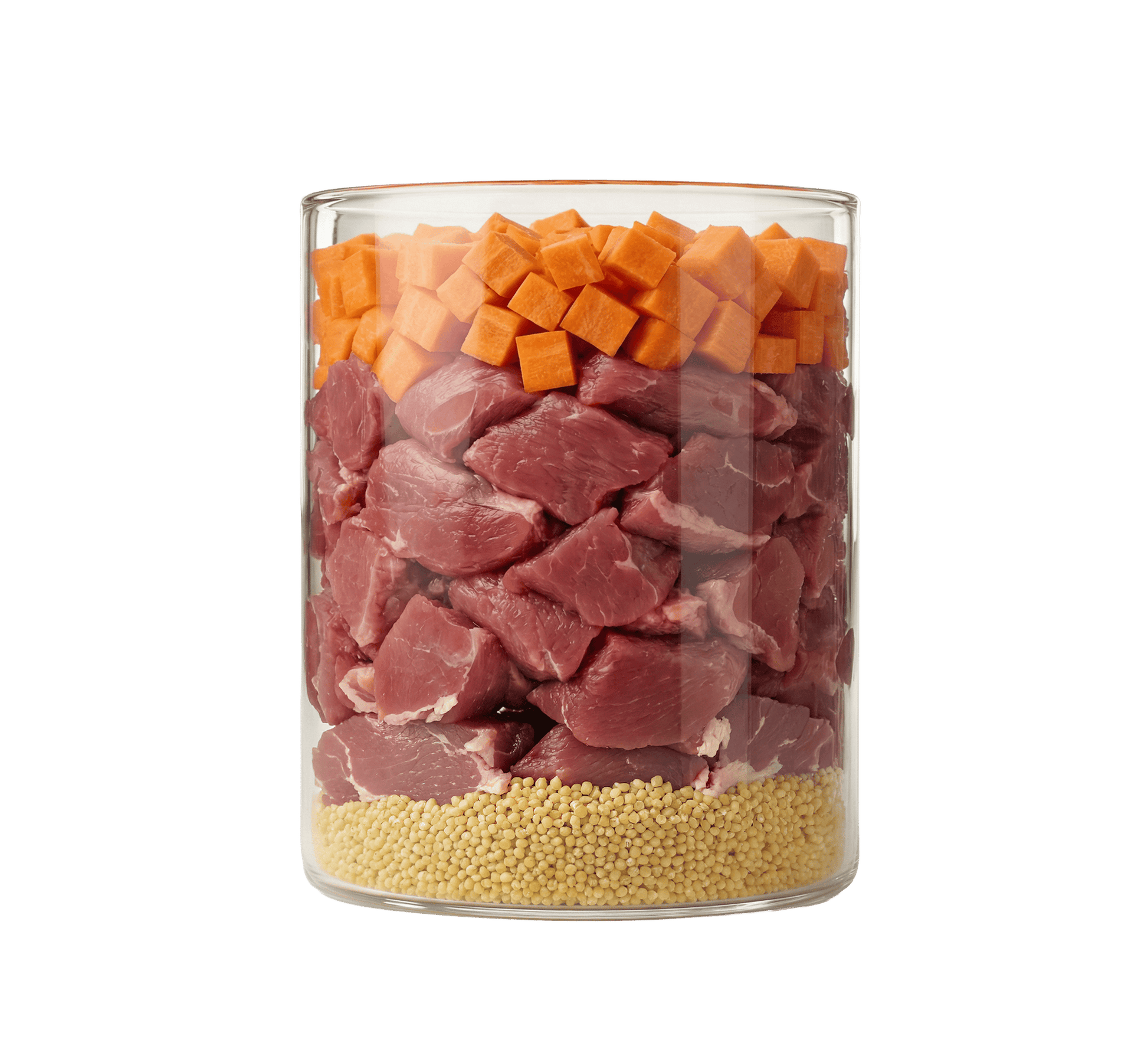 Hirse liefert wichtige Vitamine, Mineralstoffe und Antioxidantien, Karotten unterstützen Augen, Haut und Verdauung. Schonend verarbeitet, garantiert unser Menü höchste Qualität – natürlich wie immer ohne Zusätze, Knochenmehle oder Schlachtabfälle.